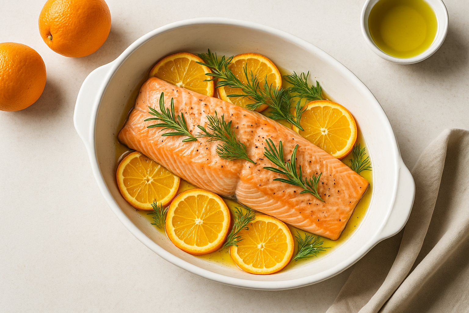 Riv apelsinskal, pressa saften och blanda med olivolja, honung, rosmarin och peppar.