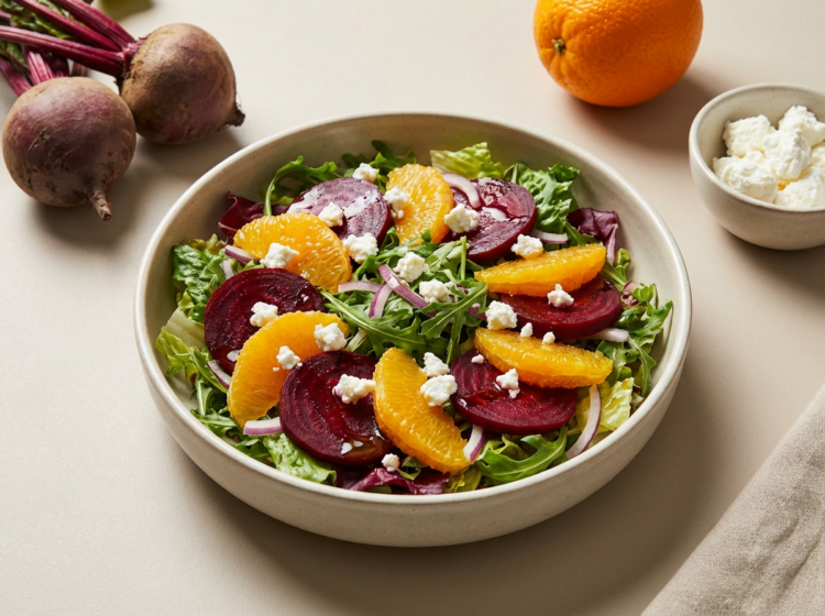 Citrus- och rödbetssallad med getost och apelsin. Perfekt som tillbehör till buffé eller middag – färgstark, enkel och full av smak. Citrus- och rödbetssallad med