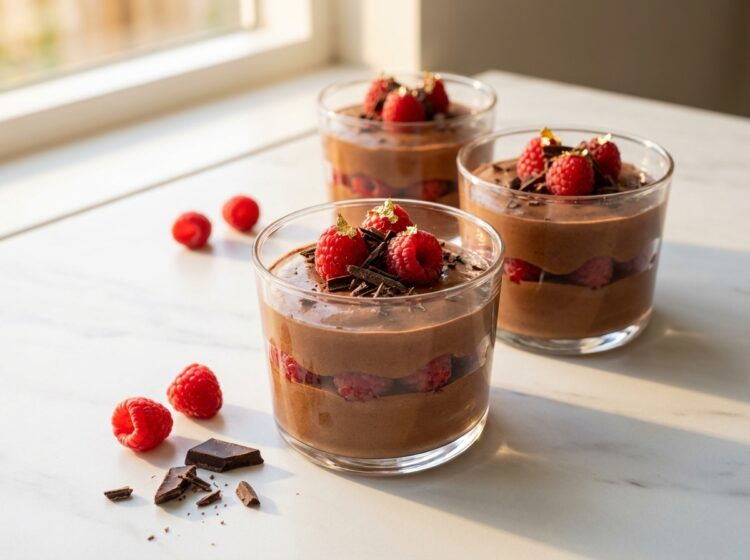 Krämig chokladmousse med hallon serverad i glas. En enkel och elegant dessert som passar perfekt till buffé, fest och mingel. 10 små portioner Ingredienser 200
