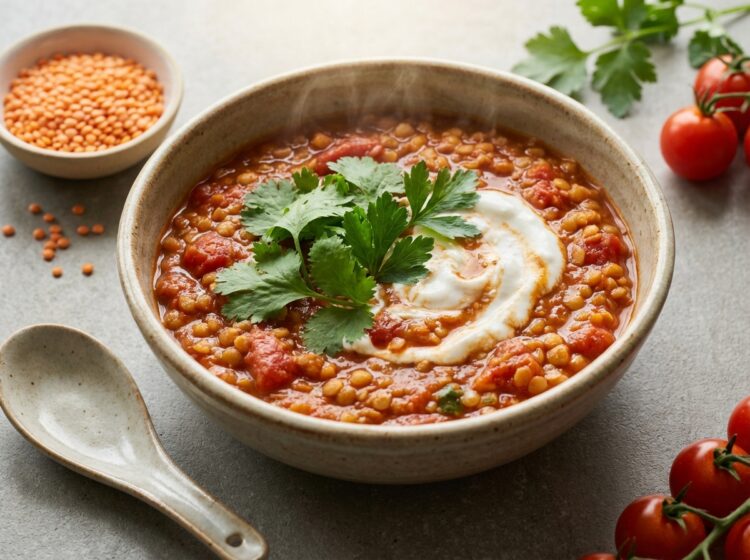 Tomat- och linsgryta med mild chili – en värmande, vegansk gryta som är enkel att laga och passar perfekt till buffé eller vardag. 6 portioner