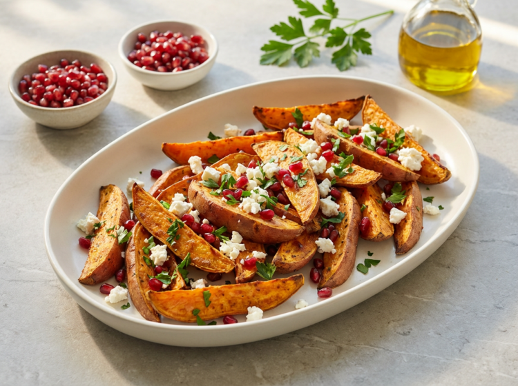 Rostad sötpotatis med fetaost och granatäpple – ett färgstarkt, enkelt tillbehör som passar perfekt till buffé, middag och fest. 6 portioner Ingredienser Gör så här