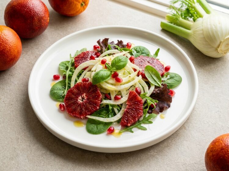 Vintercitrussallad med fänkål, blodapelsin och granatäpple. En enkel och färgstark sallad som passar perfekt som tillbehör till buffé eller middag. 6–8 portioner Ingredienser Så gör