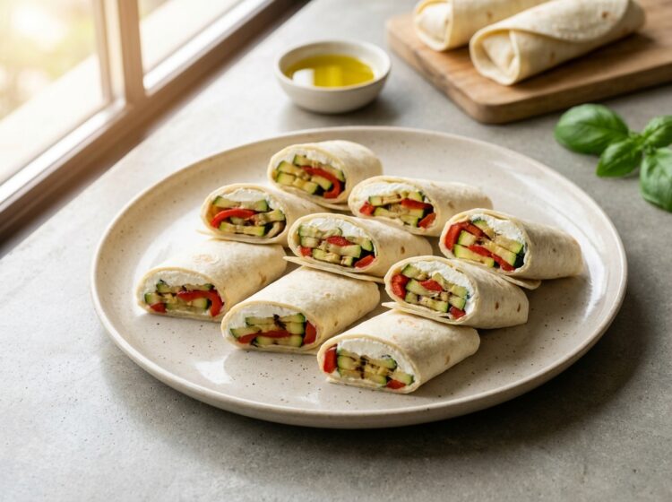 Miniwraps med grillade grönsaker och färskost – enkla, fräscha och perfekta till buffé, mingel eller möten. Lätta att förbereda och servera. 10–12 st Ingredienser Så