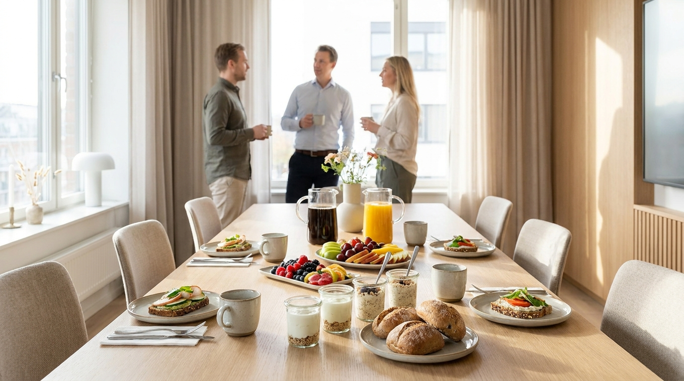 Det märks särskilt vid kickoffer och interna möten där man vill samla gruppen tidigt. Frukostbordet skapar en naturlig samlingspunkt utan att det känns formellt. Människor småpratar, fyller på kaffe och hinner landa innan agendan tar över. Det gör ofta att resten av dagen känns enklare från början.